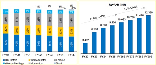 ITCHOTEL is strengthening a capital-light growth engine, as managed keys are expected to scale up, from 60% to ~66.8% by FY29E, supporting a targeted 2.5x rise in management fees. A robust F&B platform, contributing 40% of total revenue in FY25, continues to deliver premium throughput through iconic dining brands and strong banqueting momentum. Adjacent revenue streams add further depth, to the topline, with memberships and experiential offerings set to grow 3x over the next five years, complemented by integrated developments, such as Sapphire Residences. We expect this integrated model to drive a 230 bps margin expansion over FY26E–FY29E.