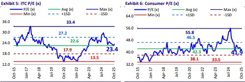 * If ITC sustains mid-single-digit volume growth in the cigarette business and the FMCG business sees a recovery in 2HFY26, we expect a valuation re-rating. We reiterate our BUY rating on ITC with our SoTP-based TP of INR515 (implying 27x Sep’27E P/E).
