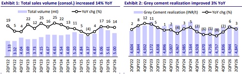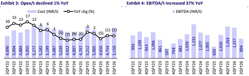 * JK Cement’s (JKCE) 2QFY26 earnings were in line with our estimates, with EBITDA growing ~57% YoY to INR4.5b. EBITDA/t surged ~37% YoY to INR894 (vs. est. INR934). OPM expanded 3.7pp YoY to ~15% (vs. ~16% est.). Adj. PAT surged 4.5x YoY to INR1.6b (in line), albeit on a low base.