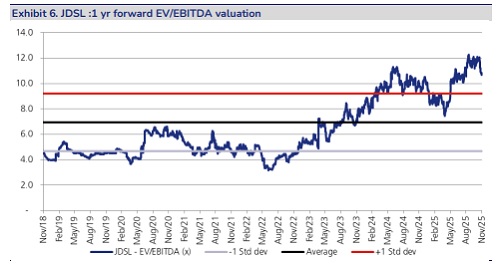 JSL reported 2Q consol. EBITDA of INR13.9bn, in-line with JMFe. EBITDA was up 6% QoQ driven by higher realizations (up ~3% QoQ) and higher scale of ops. Sales volume for the quarter stood at 648kt compared to 626kt in 1Q. Consequently, EBITDA/t came in at INR21.4k/t, up INR500/t QoQ. Key takeaways from the call – a) volume growth guidance for FY26 maintained at of 9-10% b) consol. EBITDA/t guidance for FY26 maintained at INR19-21k/t c) sales product mix for series 200/300/400 stood at 34% / 49% / 17% d) company expects Chromeni to ramp-up to ~80% utilisation level in 2HFY26 with current utilization at ~70% - to aid to margins with a higher CR to HR ratio e) Rathi turned EBITDA positive with current utilisation at 70-75% – share of rebar to go up going ahead f) Indonesia SMS capacity remains on track – expected to be commissioned in FY27. With ~12% YoY volume growth achieved in 1HFY26, company maintained its guidance at 9-10 % growth for FY26 given uncertainties related to CBAM and QCO which might impact volumes in 2HFY26 – more clarity on CBAM expected by mid-Dec’25. JSL’s Net debt stood at INR36bn as on 30th Sep’25 vs. INR39bn as on 30th Jun’25. Net Debt to EBITDA stood below 1x at 0.7x in 2Q, down from 0.9x in 1Q. Capex guidance for FY26 maintained at INR27bn including INR17bn for growth capex, INR5bn for maintenance capex and INR5bn for spillover from FY25. Strong growth pipeline and increased focus on capacity expansion augurs well for the earnings trajectory. Maintain BUY.