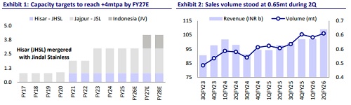 * Jindal Stainless’ (JDSL) revenue for 2QFY26 came in line with our estimates at INR109b, up 11% YoY and 7% QoQ. The growth was primarily led by healthy sales volume of 648KT, which recorded 15% YoY and 4% QoQ growth in 2QFY26.
