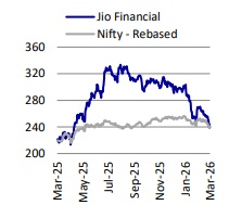 * JIOFIN offers a compelling long-term growth runway, supported by the breadth of its financial services platform and multiple embedded value-creation levers. While current valuations reflect a part of the medium-term growth potential, we believe they do not fully capture the scale opportunity across lending, asset