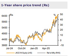 Enthused by JKCE’s strong volume growth and the industry’s pricing resilience in Q2FY25TD, we raise FY26E/27E EBITDA by ~9% each and introduce FY28 estimates. We value JKCE at 17x (unchanged) EV/EBITDA on Q1FY28E EBITDA (rolling forward basis) and arrive at revised up target price of Rs7,300 (earlier Rs6,375; up 14.5%); maintain BUY. Key risks: Decline in gray cement realization/demand or sharp rise in fuel costs.