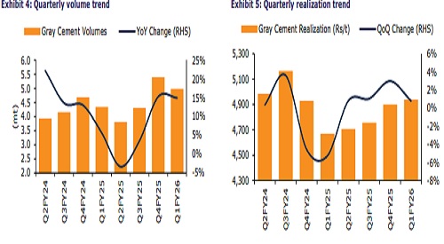 JK Cement (JKCE) reported standalone EBITDA of Rs6.75bn (up 41% YoY, albeit down 9% QoQ), beating our estimate (Rs5.9bn). Gray cement volumes were up ~15% YoY, despite the early monsoons, implying continued market share gains in core regions, incl the Bihar market. Volume growth was robust, coupled with mild pricing gains, as gray cement realization was up 0.8% QoQ (~Rs40/t). Realization gains with operating leverage benefits offset the inflation in variable costs, resulting in blended EBITDA/t of Rs1,247 (Emkay: Rs1,160), which is up 23% YoY and flat QoQ. JKCE is on track to commission the 4mtpa Panna clinker line-2 and 6mtpa grinding units (3mtpa each in Central India and Bihar) by Dec-25.