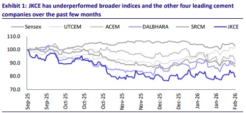 * JK Cement’s (JKCE) stock has underperformed broader indices and other top cement companies in the past few months (over Sep-Feb’26 MTD) on account of margin contraction and higher expected capacity additions in its core markets (North and Central) over the next two years. However, the company remained resilient in terms of robust volume growth, strong execution strategies, market share gains, and timely completion of capacity expansion projects. The company recently completed its 6.0mtpa grey cement capacity expansion in the Central and Bihar markets.