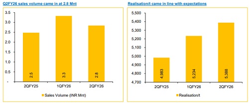 Realisation/t came in at INR 5,388/t (+8.1% YoY and +2.9% QoQ). Total cost/t came in at INR 4,656/t (+0.7% YoY and +8.3% QoQ). As a result, EBITDA/t came in at INR 732/t, which is an increase of ~INR 373/t YoY.