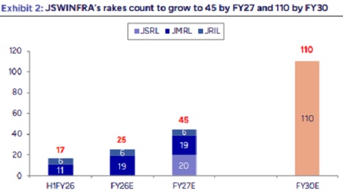 * Acquisition to strengthen rail presence: JSW Port Logistics will acquire full ownership of the 3 rail companies, giving JSWINFRA ready-made access to GPWIS and LSFTO licenses, which remain highly constrained due to the moratorium on new GPWIS issuance until Feb’27. The portfolio includes 21 operational and 4 under-delivery rakes, with a clear roadmap to scale to 45 rakes by FY27 and 110 by FY30. This immediately enhances JSWINFRA’s inland connectivity and lowers dependence on external transporters. The management expects the combined businesses to deliver annualized EBITDA of ~Rs1.5bn and Rs2.5bn by FY27E and FY28E, respectively.