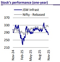 * We expect JSWINFRA to strengthen its market dominance, leading to a 15% volume CAGR over FY25-28. This, along with a sharp rise in logistics revenue, is expected to drive a 24% CAGR in revenue and a 26% CAGR in EBITDA over the same period. We reiterate our BUY rating on the stock with a TP of INR360 (based on 17x FY28 EV/EBITDA).