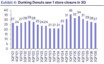 3Q26 results were largely inline with our estimates with 5% LFL growth led by robust menu innovation and focus on providing value to consumers. Popeyes is witnessing strong traction with high double digit growth and improving economics. Dp eurasia is seeing recovery with business now entirely servicing its acquisition-related debt through internal cash flows to remain impacted by inflation which has now stabalized in Turkey. Management Commentary remained healthy with Poepeye to contribute 1-1.5% towards overall growth in near term & plans to open 1,000 new stores across brands and markets in the next three years. We expect ~150bps expansion over FY26-FY28 led by 1) increase in average ticket size 2) supply chain benefits and 3) gains from tech investments and a healthy LTL outlook.