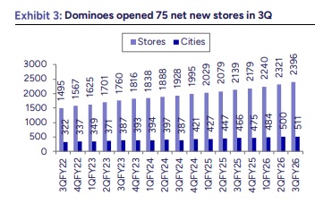 Concall Takeaways: 1) Demand remained robust in Q3, driven by sustained menu innovation. 2) Popeyes delivered strong, high double-digit growth in Q3, led by healthy order growth. 3)JUBI implemented calibrated price hikes in Q3 (notably on Sourdough pizzas). 4) Pre-Ind AS EBITDA margin expanded by 89 bps YoY and 121 bps QoQ, driven by portfolio-wide GM improvement, higher store productivity and operating leverage. 5) GM expected to sustain healthy levels, supported by calibrated price hikes and favorable mix. 6) Mumbai commissary likely to commence operations by end-Q4FY26.7) Menu innovation momentum sustained in Q3 with launch of Cheese Lava Pull Apart Pizza at Domino’s and pan-India rollout of Flavour Burst Burgers at Popeyes.8) Finance costs declined 59% YoY due to refinancing of DPEU debt from Turkish Lira to Euro. 9) New labour code expected to have a 10–15 bps margin impact in the near to medium term. 10)Capex remains elevated, led by aggressive store expansion, but supply chain capex has peaked out. 11) Domino’s mature ADS stood at Rs85,506, up 5% YoY. 12) EBITDA margin expansion guidance maintained at 200bps above FY24 levels. 14) JUBI expects to generate ~1% of online sales as ad revenue over the medium term. 15) The company is investing in AI which will reduce operating costs in long term. 16) Management indicated they are gaining market share within pizza and across relevant segments like chicken.