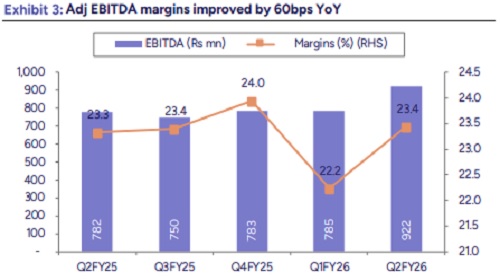 * In-line EBITDA: JLHL Q2FY26 EBITDA increased 18% YoY to Rs 922mn. There were certain one offs- unbilled revenues of Rs 192mn and related provision of Rs 123mn. Adjusted for this EBIDTA growth was 9% YoY to Rs850mn. The company has also restated prior-quarter numbers. Adjusted OPM improved 60bps QoQ and declined 50bps YoY to 22.8%. EBITDA growth was 14% YoY for 1HFY26. Reported PAT came in at Rs 574mn, up 11% YoY; adjusted for unbilled revenues, PAT was flat YoY.