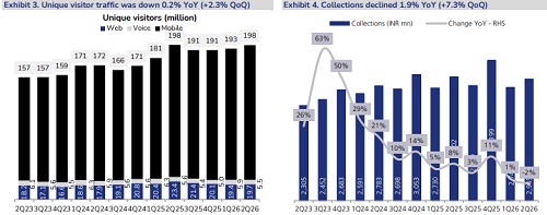 * Collections challenges sustain in 2Q: Just Dial’s revenue growth of 6.4% YoY (+1.7% QoQ) in 2Q to INR 3.03bn was weak considering that the management in the recent past had been suggesting that mid-teens growth was doable. In fact, collections were down 1.9% YoY vs. +0.6% YoY growth in 1QFY26. The collections were weak despite decent increase in net paid campaigns by 6.6k QoQ versus 4k in 1Q and JMFe of 4.8k, likely due to a sharp pick-up in monthly plans over longer duration plans during this period. Moreover, traffic trends remained flattish in 2Q despite an increase in A&P spend to INR 92mn from INR 85mn/INR 62mn in 1QFY26/2QFY25, respectively. Given the collections growth weakness in recent quarters, we conservatively build mid-single digit collections/top line growth in the near to medium term.