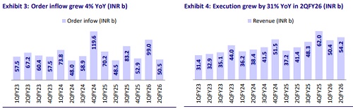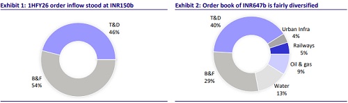KPIL’s 2QFY26 revenue at INR54b (+31% YoY) was 5% above our estimate. Growth was driven by execution ramp-up and a strong order backlog. T&D/B&F revenue grew 51%/20% YoY, while O&G/Urban Infra jumped 21%/65% YoY. Railways grew moderately by 9% YoY, while Water segment continued to witness challenges, declining 5% YoY. Absolute EBITDA grew 28% YoY to INR4.5b, in line with our estimate of INR4.4b. EBITDA margin was 8.3%, slightly below our estimate of 8.6%, owing to warranty provisions worth INR300m made during the quarter. Adj. PAT surged 51% YoY to INR2.0b, in line with our estimate. Order inflows at INR51b were up 4% YoY. The order book stood at INR647b (+7% YoY). NWC days stood at 102 in 2QFY26 vs. 118 in 2QFY25. Net debt was down YoY at INR22b in 2QFY26 (vs. INR28b in 2QFY25). For 1HFY26, revenue/EBITDA/PAT stood at INR104.6b/INR8.8b/INR4b, up 33%/32%/61%. YTD order inflows of INR150b rose 26% YoY. For 1HFY26, OCF and FCF outflow stood at INR4b and INR8b.