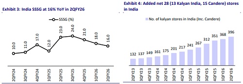* Rapid store expansion: The company added a net of 13 Kalyan stores in India, reaching a total of 300 stores. Candere added 15 stores, reaching a total of 96 stores. Total stores in India stood at 396. ‘My Kalyan’ grassroots stores reached 1,092 in 2QFY26, contributing ~13% to revenue from operations in India and over 28% to enrolment in advance purchase schemes in India.