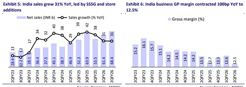 * Gross margin for the Indian business contracted 100bp YoY to 12.5%. The margin contraction was largely due to the rising mix from franchised stores (~49% revenue mix in 2QFY26). EBITDA margin for the India business remained flat YoY to 6.3%. Lower advertising costs were offset by higher employee and other expenses. PBT margin expanded 60bp YoY to 5.1%, while PBT jumped 49% YoY, fueled by interest savings on debt reduction.