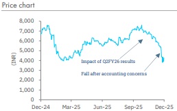 Kaynes Technology (KAYNES IN) stock price has corrected by 41% over last three months (19% after Q2FY26 results and ~22% after corporate governance issues were raised) as concerns over cash flow generation were compounded by inconsistences in accounting disclosures. While we believe that upholding rigorous accounting standards and comprehensive disclosures is paramount, market reaction to recent events is disproportionate to the scale of disclosure and accounting inconsistencies raised as there is no material impact on growth prospects and fundamentals relating to revenue and margins. Given the strong growth prospects of the company (FY25-FY28 revenue and PAT CAGR 47% & 49% respectively), and post the recent sharp correction, we believe the stock remains a compelling ‘BUY’. We maintain our EPS target (127.7) and value the stock at 42x FY27E P/E(vs 70x earlier) with a TP of INR 5,365, converging with the recent moderation in EMS industry multiples. Key monitorable deliverables for the Kaynes hereon is the ability to turn cash flow positive and reduce working capital days, absent which the potential for downside stays alive. Our base case is that the company will be able to resolve its cash flow issues by Q4FY26.