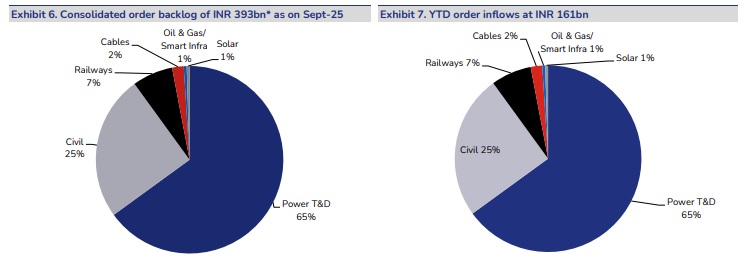 * Maintains FY26 revenue and order inflow guidance; bid pipeline robust at INR 1.8tn: With strong order inflows of INR 161bn in YTD, KEC’s order backlog stood at INR 393bn (1.7x TTM revenues) as of Sept-25. Additionally, KEC is also L1 in orders of INR 50bn+ (largely T&D). With a robust bid pipeline of INR 1.8tn dominated by T&D (c.INR 650bn) & Civil (c.INR 600bn), KEC is confident of achieving inflows of INR 300bn for FY26E. KEC has maintained its FY26 revenue growth guidance of 15% with EBITDA margins of 8% (earlier: 8-8.5%).