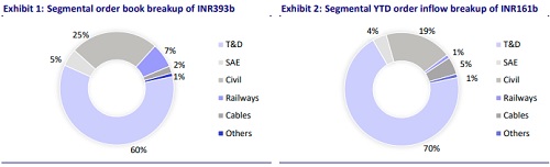Among non-T&D segments, the cable business grew 19% YoY to INR5b, supported by a better product mix and cost optimization. In contrast, civil segment revenue stood at INR12b, down 15% YoY, impacted by prolonged monsoon, labor shortages, and delayed payments in water projects. We expect execution to accelerate in 2HFY26. Railway segment revenue declined 16% YoY to INR4b, as execution was selectively focused on projects. Overall, we are building in a recovery in civil segment revenue going forward, while we expect the railway segment to remain largely flat. We expect T&D/non-T&D mix to remain around 68%/32% by FY27.
