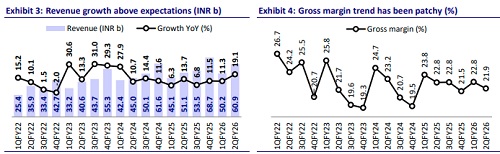 EBITDA margin improved 80bp YoY to 7.1% in 2QFY26, driven by strong execution and higher profitability in the T&D business, which has double-digit margins. The improvement was also supported by better cost absorption and operational efficiencies across key projects. We bake in margin improvement of 30bp from FY26 levels for FY27/28 as we expect the impact of low-margin legacy projects and cost overruns to get over by FY26-end. Benefits of project mix and cost optimization will also start reflecting from next year.