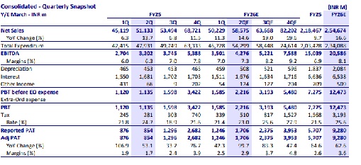 * We expect EBITDA margin to expand 100bp YoY (bridging toward 8-8.5% in FY26), supported by T&D inflows and civil stabilization.