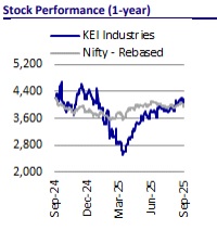 KEII delivered strong performance in 1HCY25, with over 25% growth and stable margins supported by a robust demand environment, a diversified customer base, and a significant presence across domestic and international markets. Its growing focus on the retail segment and capacity expansion would continue to drive growth for the company. We value KEII at 40x Sep’27E EPS to arrive at a revised TP of INR4,700 and upgrade the rating to BUY.