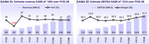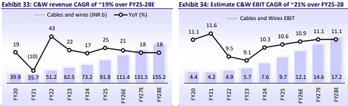 We estimate revenue CAGR at ~18% over FY25-28, led by ~19% growth in the C&W segment and ~5% growth in the SSW segment. However, EPC revenue is likely to decline ~12% p.a. during the same period, as the company is selective and has recalibrated its EPC business. EBITDA is estimated to clock ~21% CAGR, with margins expanding ~90-100bp to ~11% by FY28. PAT is estimated to post a 21% CAGR over FY25-28. We estimate a cumulative OCF of INR22.1b over FY26-28 vs. INR10.9b over FY23-25, backed by robust revenue growth and efficient working capital management, which also support its annual capex requirement of INR6-7b. Cumulative FCF is estimated at INR3.4b over FY26-28E vs a net cash outflow of INR1.0b over FY23-25. We estimate the company’s net cash to improve to INR20.9b by FY28 vs. INR15.0b as of Jun’25.