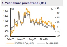 FINTECH’s Q3FY26 performance was impacted by the consolidation of Ascent Fund Services. The company delivered strong ~28% YoY and ~20% QoQ revenue growth at Rs3.7bn (largely in line with our estimate). Reported EBITDA margin of 40.9% was hit by the integration of Ascent which generated low single-digit EBITDA margin. The Domestic MF RTA business saw a ~2% shift in AUM mix toward ETFs and Passives, which led to a 2.6% QoQ decline in revenue yield. Issuer Solutions business saw healthy growth, driven by healthy annuity income and elevated corporate action activity. While Ascent currently generates low single-digit EBITDA margin, the management mentioned that it is EPSaccretive on cash basis. It remains confident about Ascent’s EBITDA margin expanding to company-level margin over the medium-to-long term as the business scales. To bake in Q3 developments, we raise our revenue estimates by ~1-2% and EBITDA margin forecasts by ~10-50bps over FY26-28, driving a ~2-3% increase in EBITDA estimates. We maintain BUY and Dec-26E TP of Rs1,400.