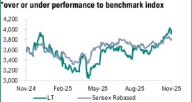 L&T’s performance in Q2FY26 was robust, with strong growth in order inflow and revenue increase in all segments, except for infrastructure projects. The company anticipates healthy revenue growth and a significant increase in order inflow, indicating a promising performance in the future. Furthermore, its healthy order book is expected to drive strong performance in the upcoming quarters. The government's continued investment in infrastructure and the manufacturing sector is likely to provide substantial growth opportunities for the company, bolstering its prospects for sustained success. Recent strategic MOUs and partnerships in the company's renewables, green energy, defense, and semiconductor businesses have laid a strong foundation for future growth, positioning the company for long-term success. Therefore, we reiterate our BUY rating on the stock with a revised target price of Rs. 4,409, based on SOTP valuation.