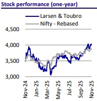 At the current price, for core E&C, LT is trading at 31x/26x/21x P/E on FY26/27/28E earnings. We maintain our estimates and continue to value the company at 28x P/E on two-year forward earnings for core business and 25% holding company discount for subsidiaries. We maintain BUY with an unchanged TP of INR4,500.