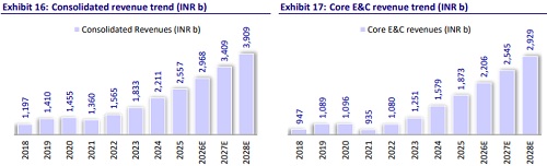 We expect a CAGR of 11% in core EPC order inflows over FY25-28. With a strong track record of execution, we expect a 16% CAGR in core EPC revenue over the same period, with core EPC margin assumption of 8.5-8.9% for FY26-28. We thus expect a CAGR of 19%/22% in core EBITDA/PAT over FY25-28.