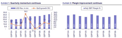 Valuations and outlook: We estimate USD revenue/earnings CAGR of 20.2%/22.6% over FY26E-FY28E. The stock is currently trading at 26x/21x of FY27E/FY28E earnings after the recent correction. We assign PE multiple of 32x (40x earlier) to FY28E earnings and arrive at revised TP of Rs490 (Rs630 earlier). Maintain ‘BUY’.
