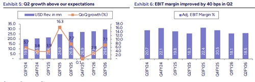 Q2FY26 revenue came in at USD 29.6 mn, up 7.1% QoQ (INR 2.57 bn, up 9.1% QoQ), ahead of our estimates of USD 29 mn / INR 2.53 bn. Growth was led by the Financial Services and CPG & Retail verticals, which delivered strong sequential growth of 24.9% and 28.5%, respectively. The Technology vertical remained soft, declining 1% QoQ after muted performance in Q1.