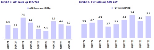 * FDF sales grew 58% YoY to INR5.2b (31% of sales). API sales (37%) rose 11% YoY to INR6.2b. Bio division sales (3%) grew 18% YoY to INR470m.