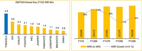As of end-H1FY26, THELEELA operated a portfolio of 3,544 luxury keys. The company has commenced its first international expansion through a strategic investment in a Dubai luxury hotel adding ~546 keys (including 182 residence keys) and an acquisition of resort in Coorg adding 71 keys, taking its total current inventory to ~4,161 keys. Concurrently, THELEELA is entering one of India’s most underserved hospitality corridors at Bandra - Kurla Complex (BKC), Mumbai, with a planned 250-key owned ultra-luxury hotel. THELEELA has a strong visible pipeline of ~1,008 hotel keys, including BKC. Alongside, it has 38 keys under development at Udaipur, 19 keys at Coorg and ~245 branded residences across Dubai and Mumbai, providing clear mediumterm growth visibility and reinforcing into a globally scaled hospitality platform