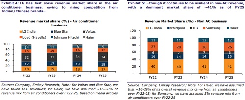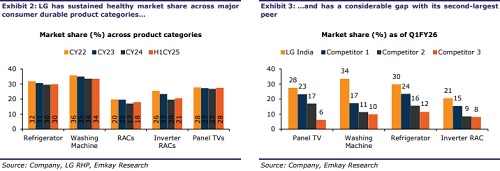 LG is the benchmark franchise, with market leadership across categories: Refrigerators (34%), Washing Machine (30%), TVs (20%), and RACs (18%) in Q1FY26. LG commands a higher market share in premium categories: ~25% of its revenue (vs ~15% industry); likely to rise to ~40% (vs industry’s ~27%) over 5Y. As part of the ‘Global South’ strategy, India is crucial and likely to contribute 1/3rd of growth for LG Korea over the next 5Y.