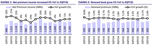 * In 2QFY26, LIC reported net premium income of INR1.3t (in line), which grew 5% YoY. Renewal premium grew 5% YoY to INR650b and single premium grew 8% YoY to INR508b. First year premium declined 3% YoY to INR108b.