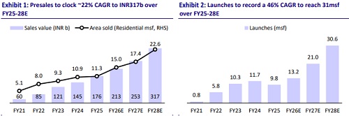 * Building on its strong presence in MMR, Pune, and now Bengaluru, it is set to achieve a 22% presales CAGR over FY25-28E, reaching INR317b in FY28E, backed by a strong launch pipeline and healthy execution capabilities.