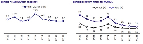 * We model MAHGL’s volumes to clock an 11% CAGR over FY25-28 and estimate an EBITDA margin of INR8.7-9.2 per scm during the period. MAHGL currently trades at 11.2x FY28E SA P/E. We now value MAHGL at 15x Dec’27 P/E (15x FY27 P/E earlier), resulting in a TP of INR1,700. Reiterate BUY.