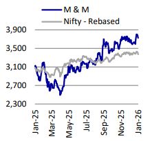 - Valuation and View: We believe MM is well-placed to outperform across its core businesses, led by a healthy recovery in rural areas and new product launches in both UVs and tractors. We estimate MM to post a CAGR of ~19%/18%/21% in revenue/EBITDA/PAT over FY25-28E. Given the multiple long term growth drivers in the company, we continue to reiterate our BUY rating on MM with a TP of INR 4,521 (valued at Dec’27E SoTP).