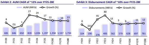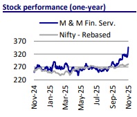 * MMFS currently trades at 1.8x FY27E P/BV and 14x FY27E P/E. With a projected PAT CAGR of ~19% over FY25-FY28E and RoA/RoE of 2.2%/14% in FY28E, we reiterate our BUY rating with a TP of INR400 (based on 2x Sep’27E BV).