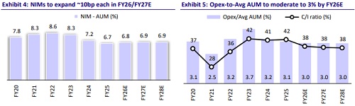 * MMFS underscored the substantial progress achieved over the past three to four years during its rebuilding phase, particularly in underwriting, collections, and technology, which has translated into materially improved and wellcontained asset quality. The company also outlined its medium-term aspirations of 18-20% AUM growth, through cycle credit costs of 1.5%-1.7% and RoA of 2.2%-2.5%. We have not made any changes to our estimates and will instead wait for early proof of execution before upgrading our estimates on AUM growth.