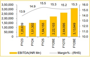MM is a leading player in India's automotive and farm equipment sectors, with a strong presence in SUVs, tractors and electric vehicles, supported by the launch of new EV models. MM benefits from its strong brand equity, an extensive distribution network and tech-driven mobility solutions. In Q1FY26, MM reported revenue of INR 341,4Bn with an EBITDA margin of 14.0%. Revenue is expected to expand at a CAGR of 20.0% over FY25–28E, supported by sustained rural demand, an expanding EV portfolio and a growing SUV segment.