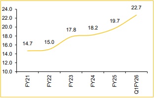MM has strengthened its position in India’s auto industry with consistent market share gains in key segments. As of Q1FY26, the company has expanded its MUV market share to 22.7%, capitalising on the rising demand for utility vehicles. In the commercial segment, MM leads with a 45.5% market share in the LCV segment. Additionally, MM’s tractor market share has reached 45.2% in Q1FY26, highlighting its stronghold in rural as well as agricultural sectors. With a well-diversified portfolio across high-growth categories, MM is well-positioned to sustain its growth momentum and capitalise on evolving consumer preferences.