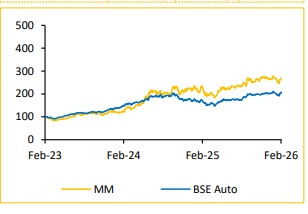 Sustained Momentum across ICE and EV Segments: MM continues to solidify its leadership in the automotive sector, delivering a 26% increase in SUV volumes and maintaining its number one position in revenue terms. The company demonstrated strong pricing power and brand appeal, evidenced by the XUV 7XO, where over 70% of demand favours top-tier variants. This product mix supported healthy profit margin, which expanded by 90 basis points to 10.4% on a standalone basis, excluding Labour Codes’ impact and eSUV. Furthermore, the company is successfully executing its electric vehicle transition. EV sales surpassed 41,000 units, averaging 4,000 per month, with the new 9S model gaining traction among customers seeking conventional SUV designs. To sustain this growth, the management has outlined aggressive capacity expansion plans, aiming to add 6,000 to 7,000 units per month by mid-2026, followed by significant capacity addition from a new plant in Chakan in 2027 and a greenfield facility in Nagpur by 2028.