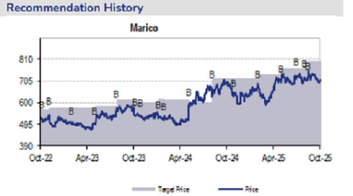 Continuing with the recent trend, Marico’s pre-quarter update points to yet another strong quarter. Despite GST-led disruption, revenue growth in the 30s is better than our estimate of c.28% largely due to better-than-envisaged growth in VAHO and lower volume decline in Parachute. EBITDA/PAT growth is expected to be moderate given the steep inflation in copra and higher brand investments. While Marico has demonstrated strong pricing power in core portfolio, unprecedented copra inflation will weigh on FY26 profitability (especially in 1H). Going ahead we see margin pressures bottoming out with a) likely moderation in 2H (copra prices down c.10% from peak), b) recovery in better margin VAHO portfolio and c) improving execution on portfolio diversification (Foods & Premium personal care which is now c.22% of India sales with EBITDA margin at breakeven level) both in terms of sales/profitability. Successful execution should result in better EBITDA growth going ahead thereby driving overall earnings growth (est. c.13% CAGR over FY25-28E) and can also lead to upsides to our current margin estimates. We like Marico’s strength in core, relatively better execution on portfolio diversification and International business vs. peers. We maintain BUY with a revised TP of INR 825 (48x Sep’27 EPS).