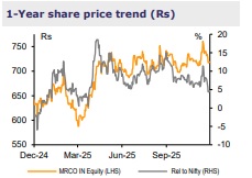 With thrust on profitability, focus on driving mid-teens earnings growth The company targets a mid-teens earnings CAGR for the next five years, with a focused approach to diversifying profitability. Historically, Marico was highly skewed toward the coconut oil portfolio for driving profitability, which it looks to arrest in the next 5Y. The focus ahead is to enhance profitability in the food portfolio through corrective actions. Additionally, as new-age brands see profit enhancement, they will add to current margins. Copra prices have eased by ~20% from their peak – this provides an opportunity to improve margins. Further, with the next flush expected from Mar-26, we see price stability, which is positive for Marico. The mgmt expects margins to be better in 2H versus 1HFY26. Amid new engines of growth, it aims for a double-digit OPM from digital-first premium personal care offerings, while for food, efforts are on to drive profitability.