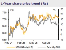 We retain BUY on Marico, with Sep-26E TP of Rs850, on 50x P/E, as we maintain that the company would continue clocking better volumes backed by execution. In Q2, its core portfolio saw weak volume owing to healthy pricing, while new businesses continued to aid the company in attaining 7% volume growth. Given the sharp inflation in copra prices, gross margin contracted by 810bps YoY (to 42.6%), though the positive operating leverage helped containing EBITDA margin contraction at 350bps (to 16.1%). Copra prices, after correcting 15% from the Jul-peak, have been stable. We expect prices to be steady, with limited seasonal arrivals (next flush expected from Mar-26). Factoring this in, we lift our revenue and cut our margin expectations for FY26.