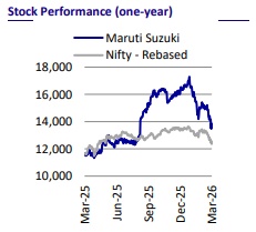 MSIL’s recent underperformance relative to the Auto index is likely to be driven by 1) near-term underperformance in wholesale and 2) disappointing 3Q performance. However, we believe these concerns seem to be overdone, given that retail demand for MSIL remains healthy, both in cars and UVs, and the same is reflected in its outperformance in retail sales post-GST cut. Further, its near term wholesale has been capped by capacity constraints, which is likely to be addressed from Apr’26 onwards as its new capacity comes on stream. We expect MSIL to outperform industry growth in FY27, aided by its healthy launch pipeline, which includes: 1) a new Brezza variant, 2) the recently launched Victoris and e-Vitara, and 3) at least one more new launch in FY27E. Further, its export momentum is likely to remain healthy as it works towards its medium-term target of 750,000–800,000 vehicles by FY31 – it has already surpassed its FY26 target in Feb26. Further, we expect the increase in input cost pressure to be offset by reducing discounts, improving mix, and normalizing pricing in cars. Overall, we factor in MSIL to post 16% earnings CAGR over FY25-28E. We reiterate our BUY rating on MSIL with a TP of INR17,406, valued at 26x Dec’27E EPS