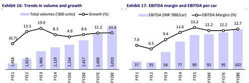 Suzuki Japan is shifting more and more of its export market production from Japan to India. Further, the alliance between Toyota and Suzuki offers longterm growth opportunities, as Toyota’s global markets are now accessible to Maruti. Suzuki has made India its global production hub for the e-Vitara and the Victoris. Led by a strong demand momentum across multiple markets, MSIL has already surpassed its export target for FY26 of 400k units in Feb’26. It continues to work towards its medium-term target to export 750,000–800,000 vehicles by FY31. Given the tailwinds highlighted above, we expect MSIL to post 25% volume CAGR in exports over FY25-28E.
