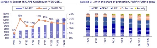 * Multiple levers to sustain growth momentum: 2QFY26 APE grew 15% YoY driven by protection and NPAR and company expects the momentum to continue to H2. It expects near-term tailwinds in retail protection volume post GST exemption and expects a recovery in credit life disbursals to drive growth. Newly launched products - Smart VIBE (NPAR), SWAG 2.0 (PAR) and SWAG Pension (Annuity) are seeing strong traction and are expected to offset the de-growth in ULIP (-9% YoY in Q2). Over the medium-term, company expects to maintain a diversified product mix with ~35% in ULIP, 15%/ 25% in PAR/ NPAR, 10-15% in protection and 5-7% in annuity. We build an APE growth of 16% CAGR over FY25-28E driven by robust growth in protection and new launches across PAR/ NPAR/ annuity.